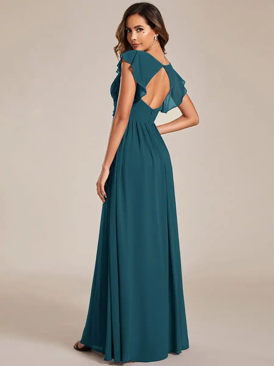 This floral bridesmaid dress features a flattering V-neckline and an open back for a modern, elegant look. The ruffled sleeves add a touch of romance, while the flowing chiffon fabric ensures comfort and movement. Perfect for summer weddings, it's designed to make your bridal party feel as beautiful as they look.